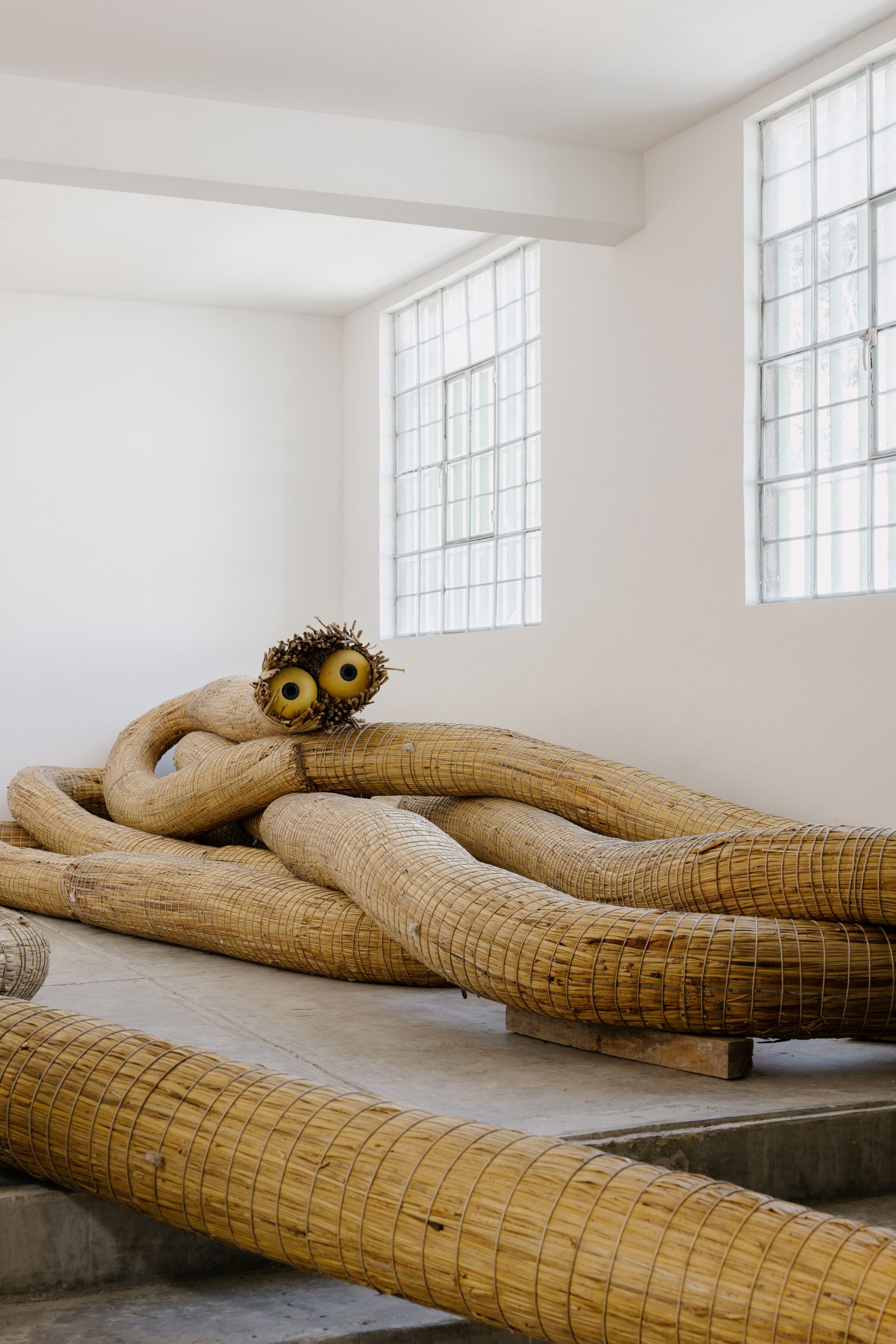 Inspired by traditional benches made by the Uros people of Lake Titicaca, Peru, this installation is filled with reused plastic bottles to keep it light. It is an 87-meter-long roll of totora reeds that curls and twists inside the Chicago Architecture Biennial near Lake Michigan. The piece resembles a giant eel, symbolizing the feeling of being out of place. It traveled from Lake Titicaca, through Mexico City—which was once a lake—and now rests by Lake Michigan. Its twisted, segmented form reflects the fragility of nature as Lake Titicaca’s water levels fall due to climate change. Designed to survive its long journey, visitors are invited to sit, climb, and play on it, reshaping it over time. A video shares the story of its travels, highlighting the connection between local and global environments in a time of crisis.